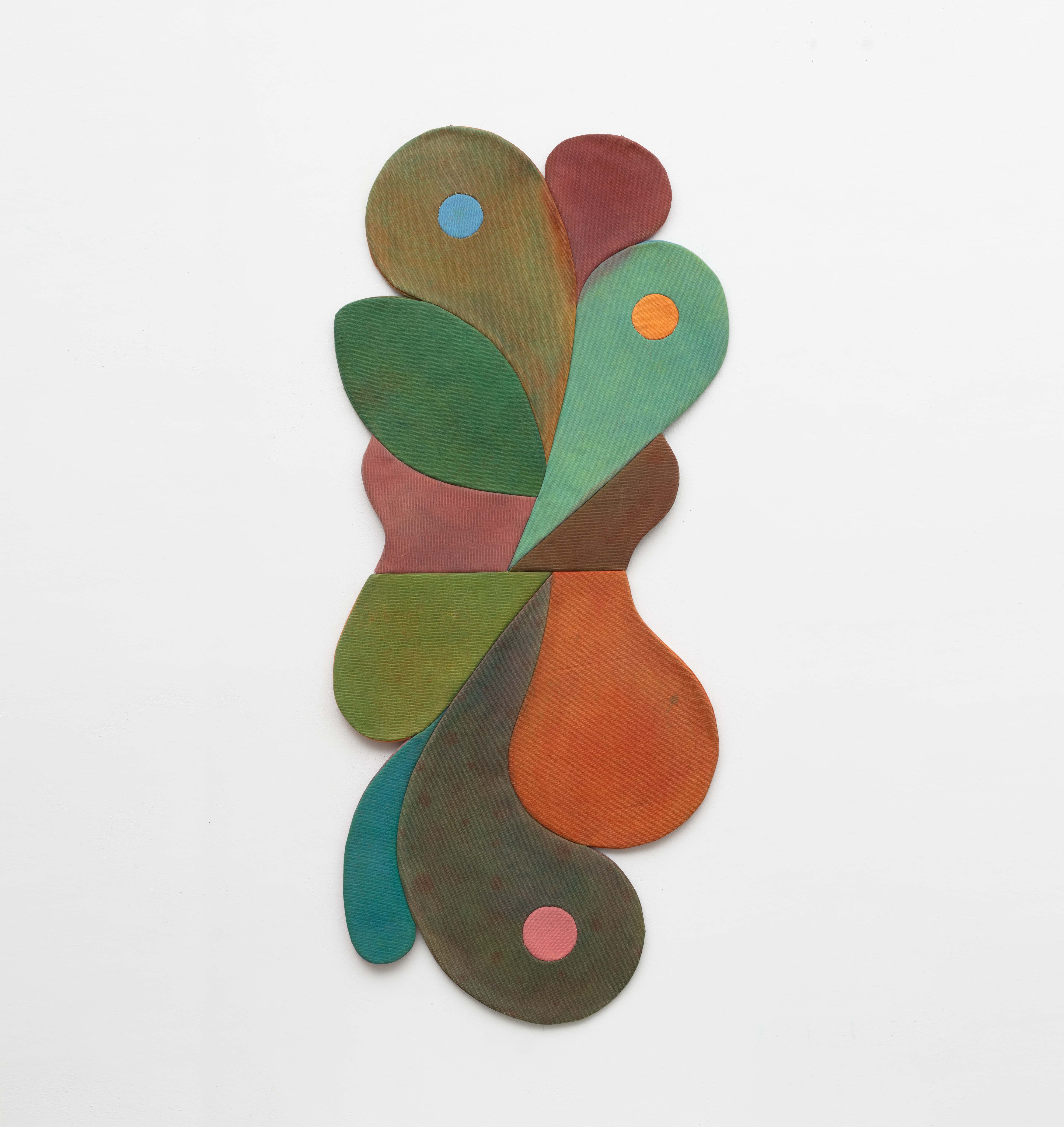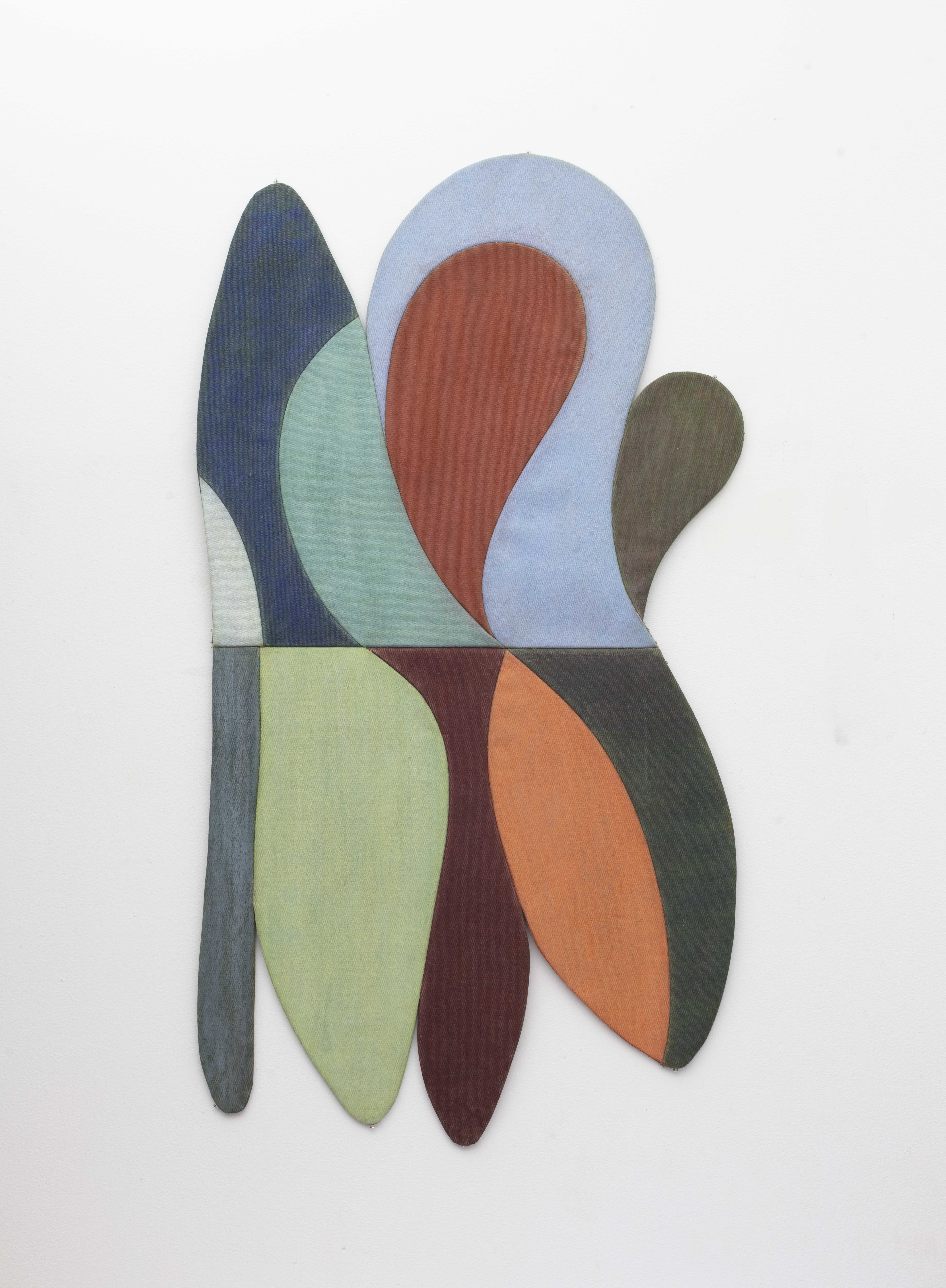 pigment dispersion and acrylic on burlap, canvas and denim, upholstery thread, felt, eye-hooks